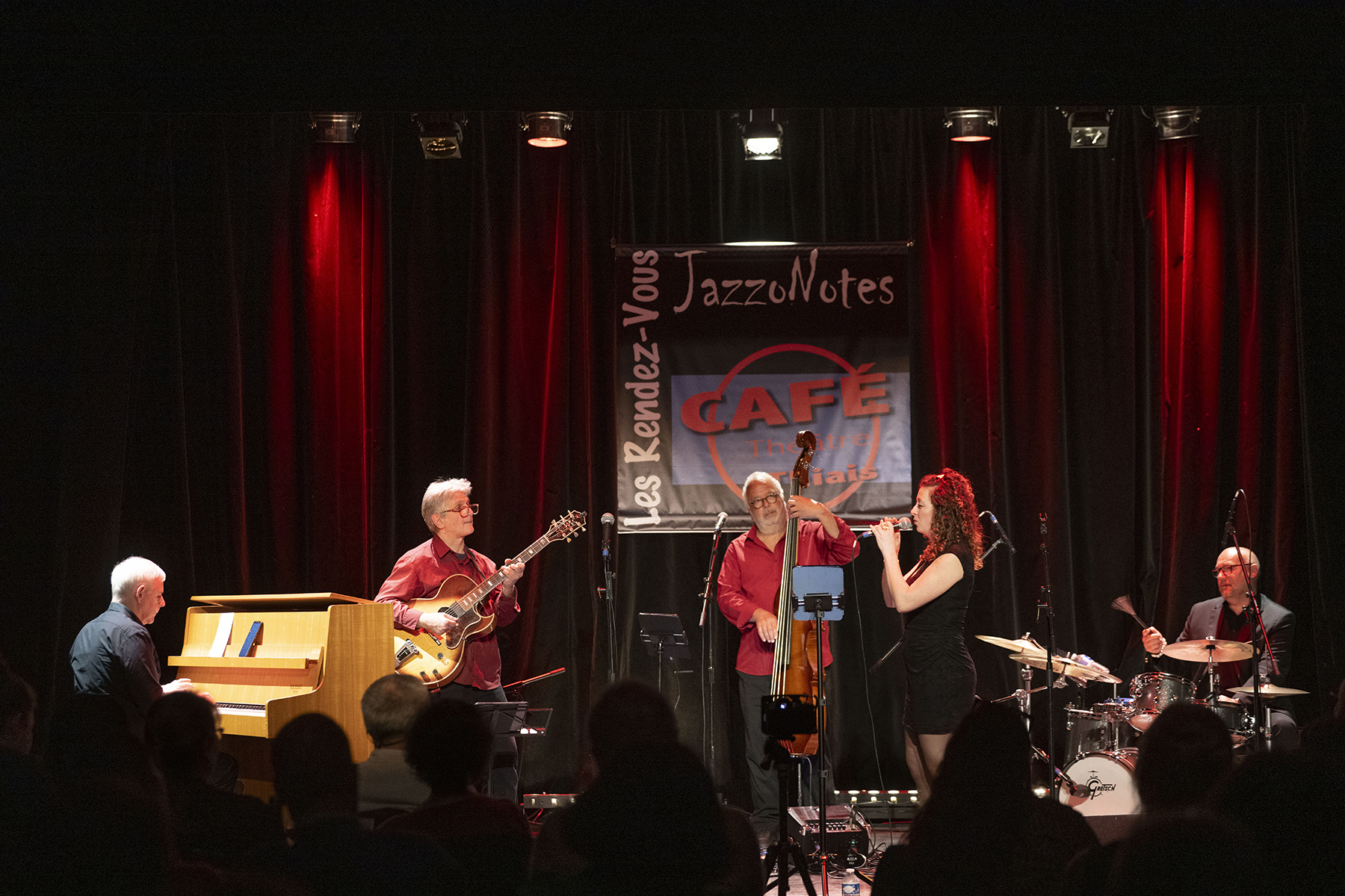 "Jazzroom 2047", quintet jazz original (accordéon, voix, guitare, contrebasse, batterie) mené par Delphine Galvès séduit par ses arrangements inspirés et l’efficacitéde son groove.