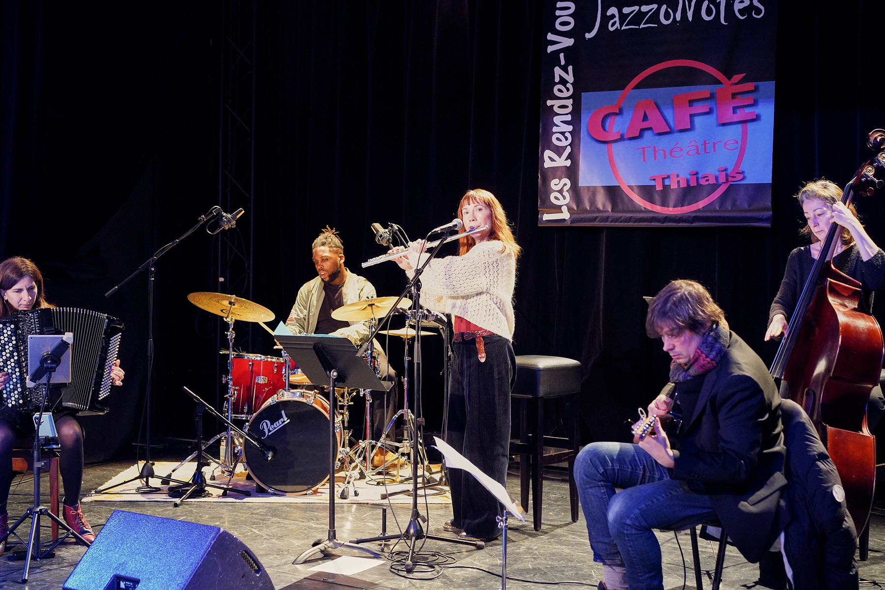 "Jazzroom 2047", quintet jazz original (accordéon, voix, guitare, contrebasse, batterie) mené par Delphine Galvès séduit par ses arrangements inspirés et l’efficacitéde son groove.